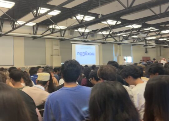 Image from Kavya Datt, Caption: WHS students cram into the cafeteria to see a presentation on AP registration information At Washington High School,…